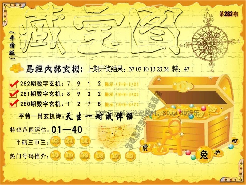 282期:平特藏宝图玄机:【天生一对成伴侣】 解:天生一对成伴侣,解兔,平特兔 推荐平码:10.19.30.18.17.40 开奖结果:04.33.25.30.38.12T41 |