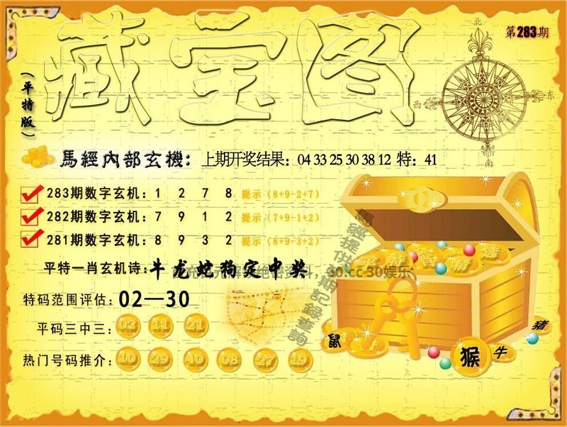 277期:平特藏宝图玄机:【今期生肖找荷花】 解:今期生肖找荷花,解虎,平特虎 推荐平码:12.29.40.28.30.17 开奖结果:46.11.41.33.48.37T16 |
